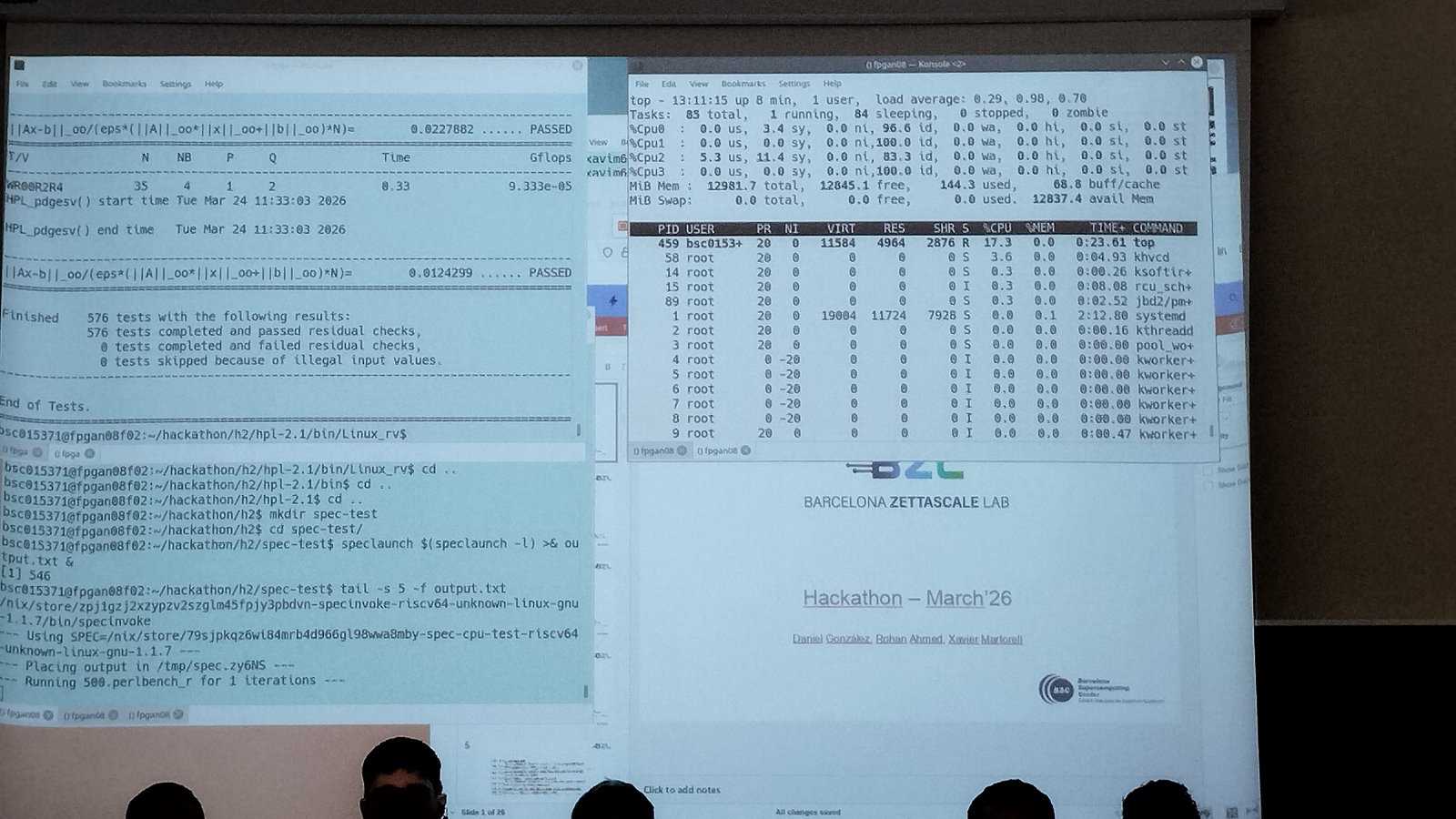 Building on the achievements of the first hackathon, the event aimed to validate and refine the use of RISC-V systems for demanding computational workloads. During the first hackathon, participants demonstrated the feasibility of running HPC workloads on RISC-V architectures, including multi-core and multi-node execution through MPI-based LINPACK benchmarks. These early results provided valuable insights into system performance, tooling, and overall user experience, while highlighting key areas for improvement such as FPGA connectivity, cross-compilation workflows, preconfigured environments, and vector processing performance.
